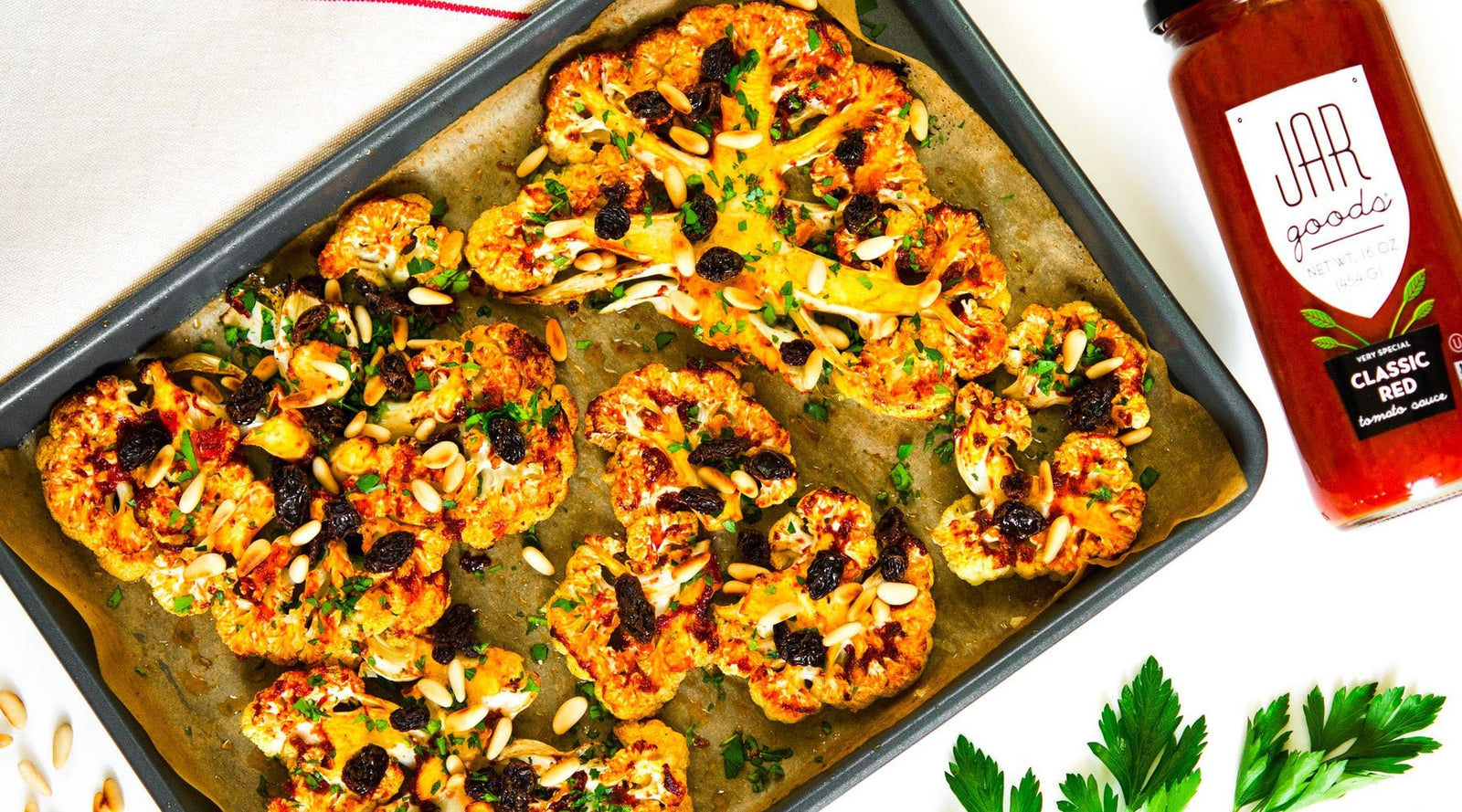 This is an amazing recipe whether you are vegan or simply searching for the perfect side dish. Packed with flavor, the cauliflower caramelizes as it roasts and then is topped with a touch of sweet from the currants and salty crunch from the pine nuts making each bite a treat.